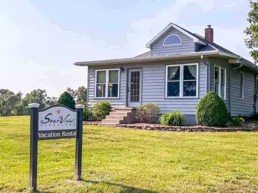 The front entrance to a one-story home painted in blue and white. A lawn sign says "StarView Vineyards Vacation Rental." StarView is among the best wineries on Shawnee Wine Trail.