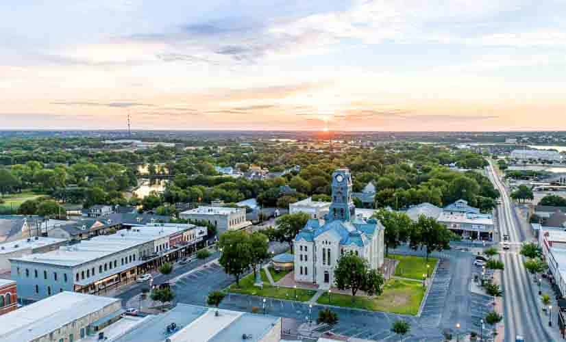 Aerial view over downtown Granbury, Texas at sunset.